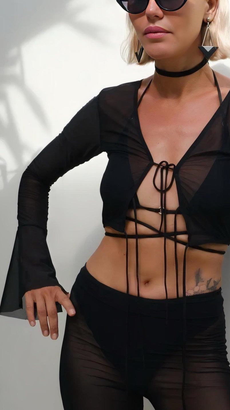 A sheer blouse with flared sleeves — lightness and elegance in every detail.The semi-transparent fabric and front ties create a delicate, fitted silhouette, while the flared sleeves add a sense of airiness and movement.A perfect choice for those who appreciate versatility and femininity in one look.