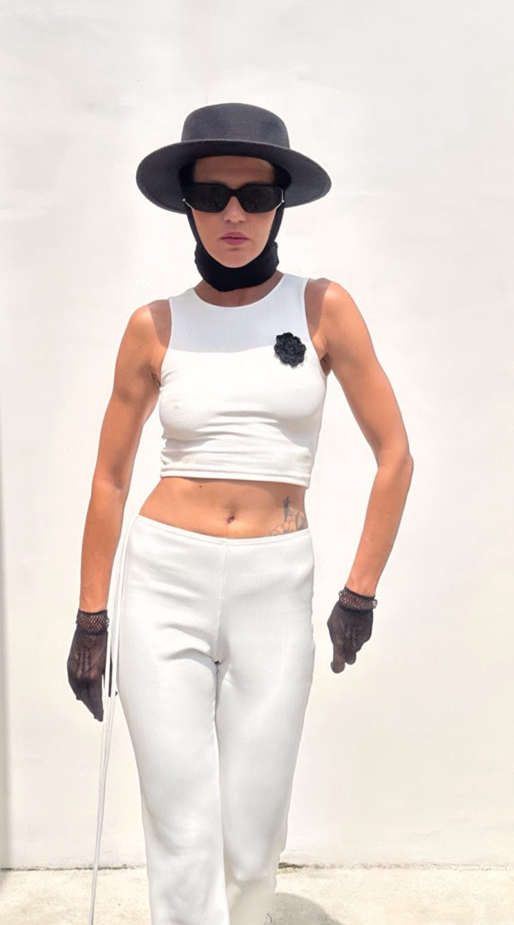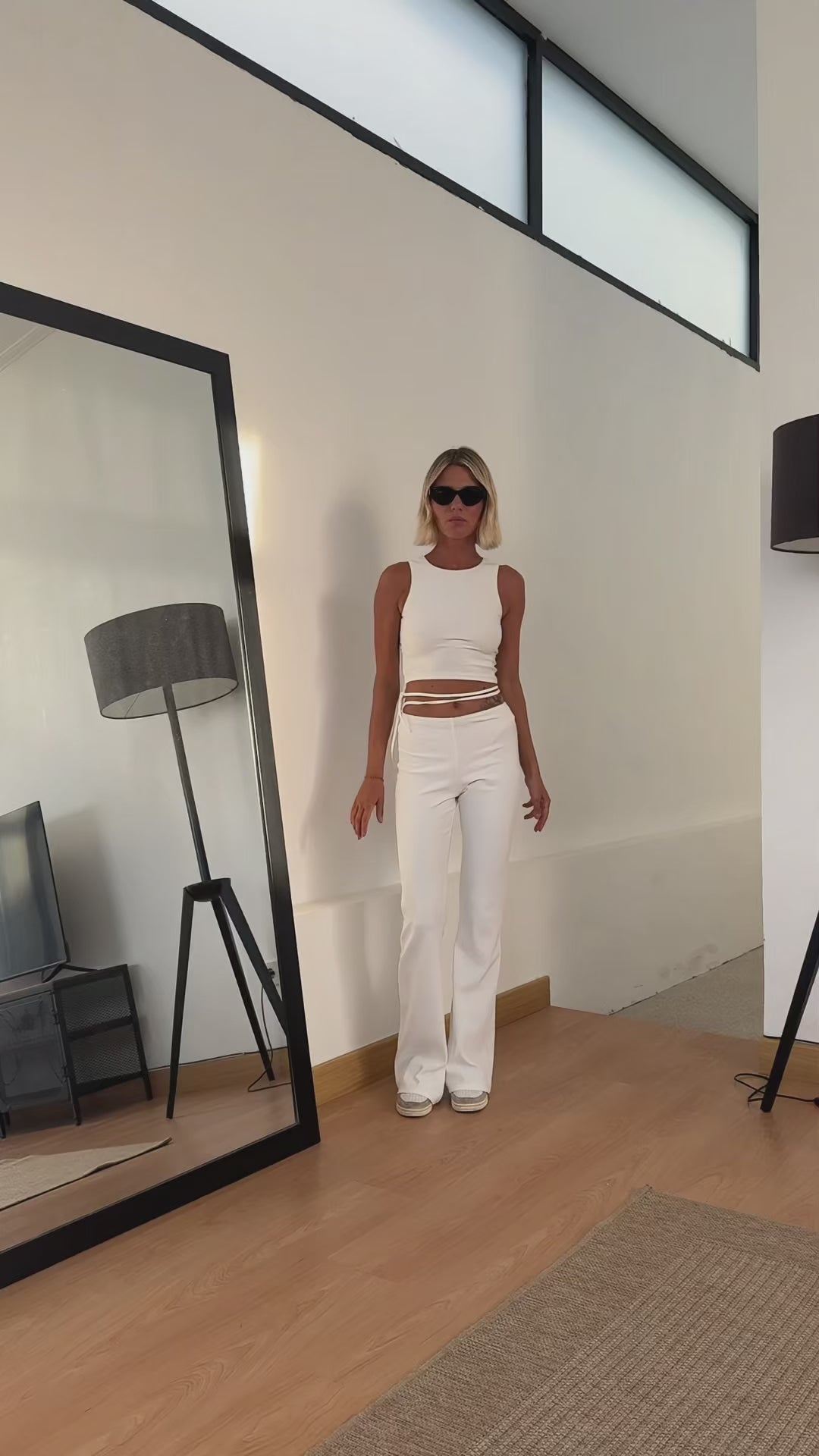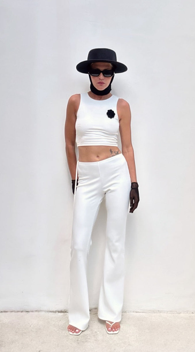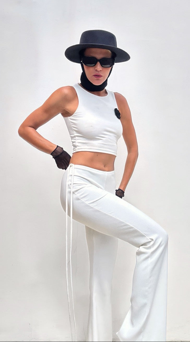 An exquisite white suit consisting of a stylish top and flared trousers with ties — the perfect blend of elegance and comfort. The trousers with ties accentuate the waist, adding lightness and grace to the look.This set is ideal for both city strolls and evening events.