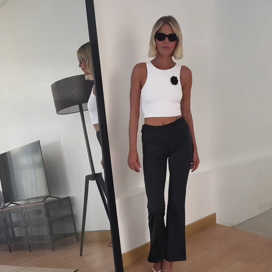 These cropped flared trousers are a stylish wardrobe piece with a nod to retro aesthetics.Perfectly paired with tops, blouses, or blazers — whether for a casual outing or a striking event.