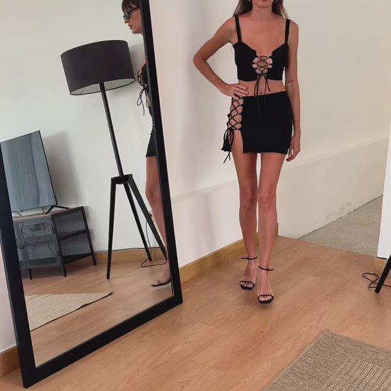 Bold and sexy, this short lace-up skirt is a striking wardrobe piece for those who aren’t afraid to stand out.The sleek cut pairs with daring details to highlight your figure and add confidence and allure to your look.